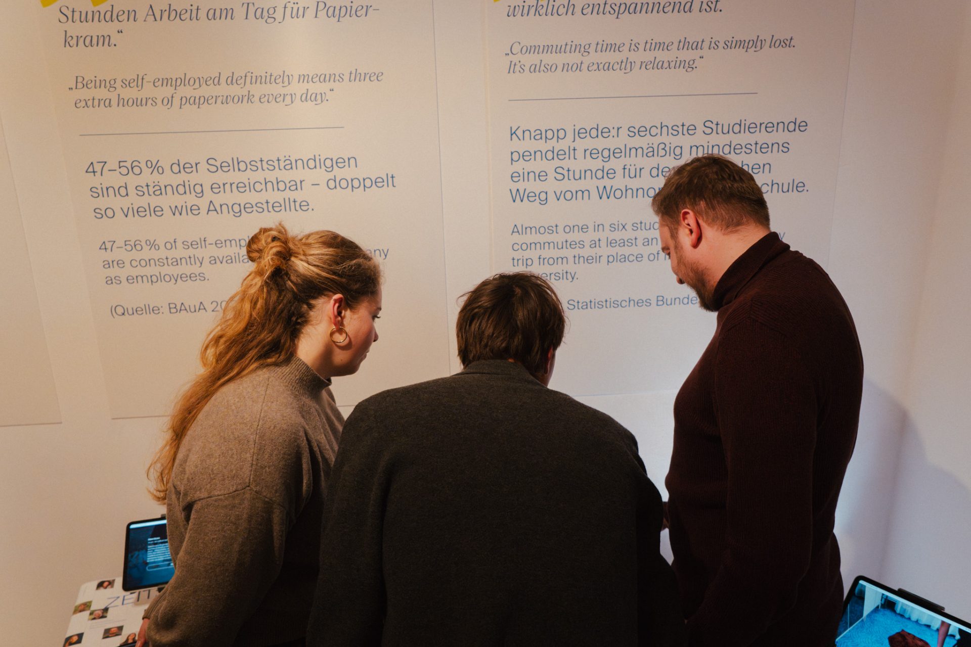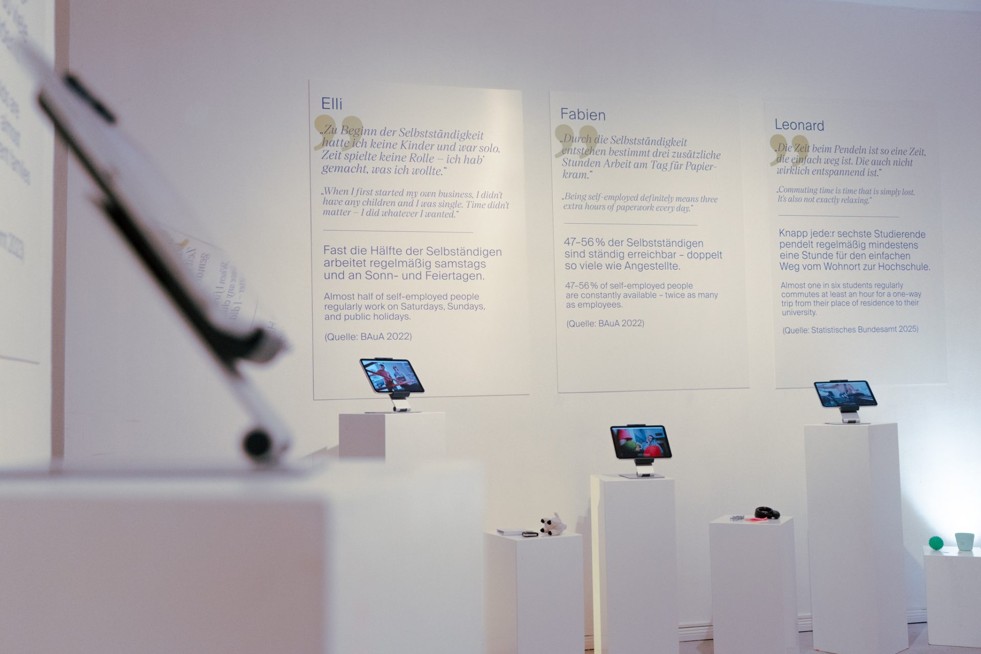 Im dritten Raum schließlich öffnete sich der Blick auf konkrete Lebensrealitäten. Sechs Teilnehmende der Zeittagebücher des Zentrum für neue Sozialpolitik wurden in Objekten, Fotos, Zitaten und interaktiven Kalendern vorgestellt. Das Erlebbare wurde kontextualisiert durch Statistiken, die die Ungleichverteilung von Zeit in Deutschland wissenschaftlich unterlegen.