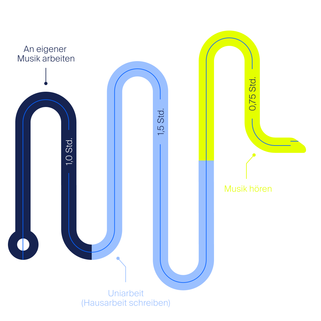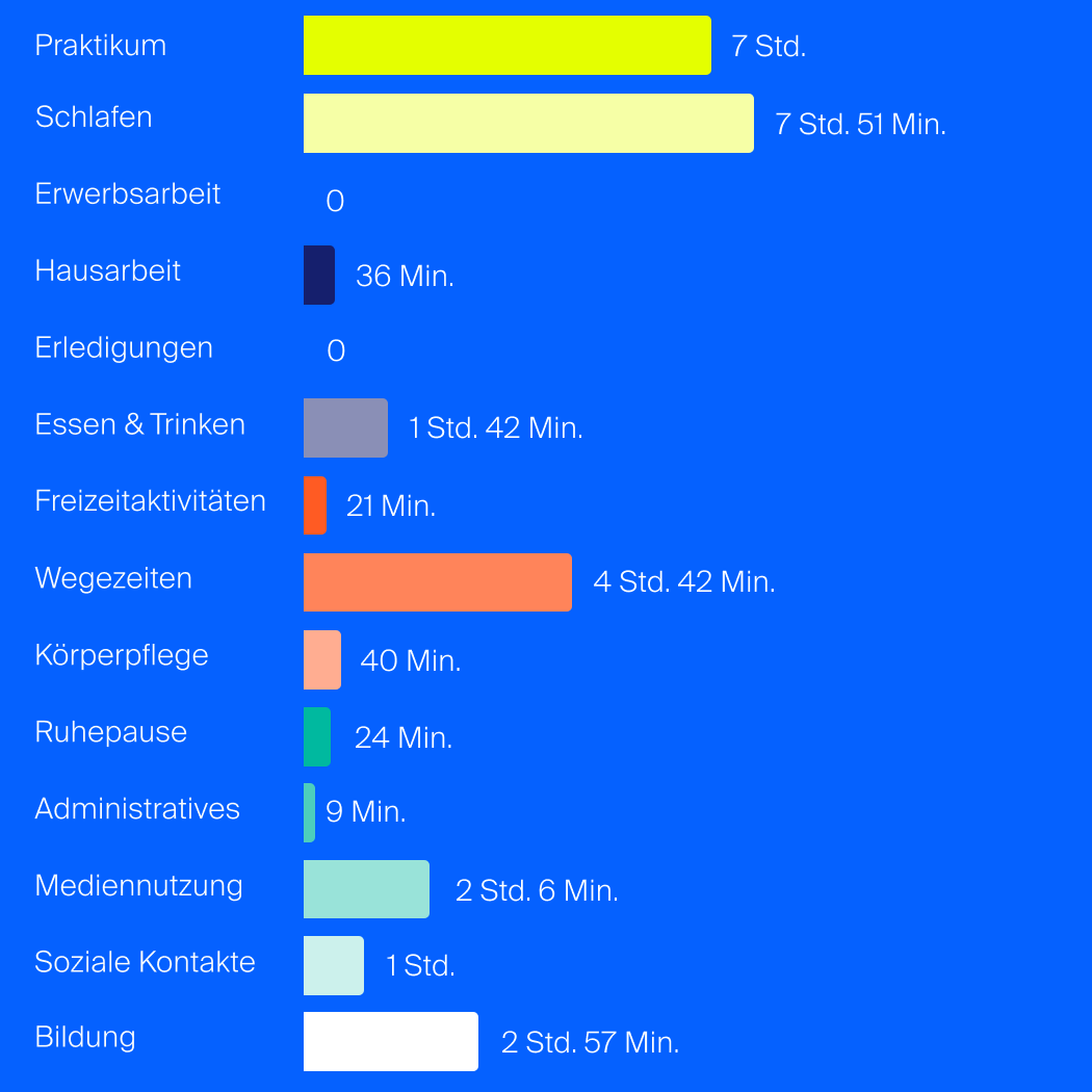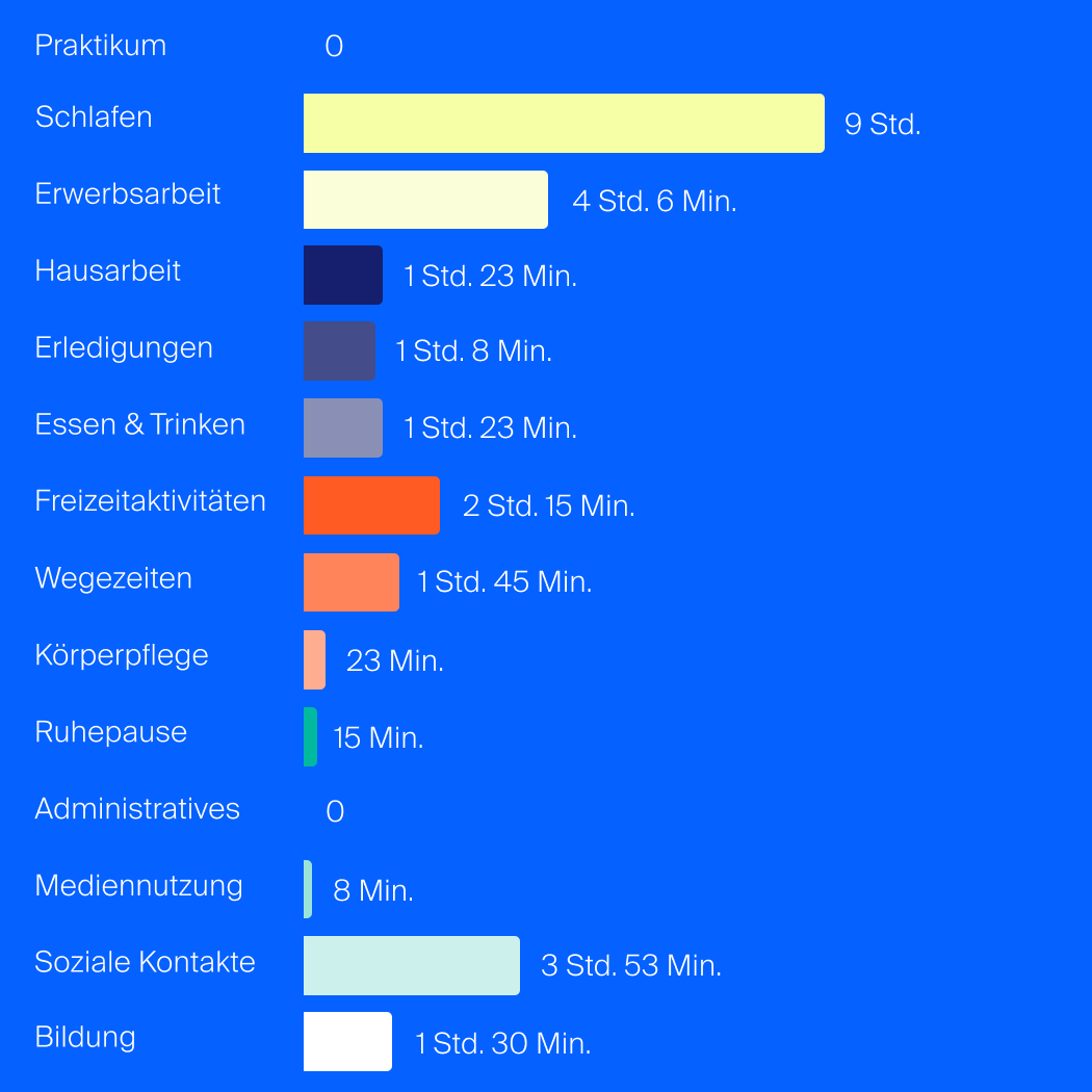 Am Wochenende verschieben sich die Schwerpunkte: mehr Schlaf, etwas mehr soziale Zeit, dafür neue Aufgaben im Haushalt und Studium. Die freie Zeit dient weniger der Erholung als dem Nachholen all dessen, wofür unter der Woche kein Raum bleibt.